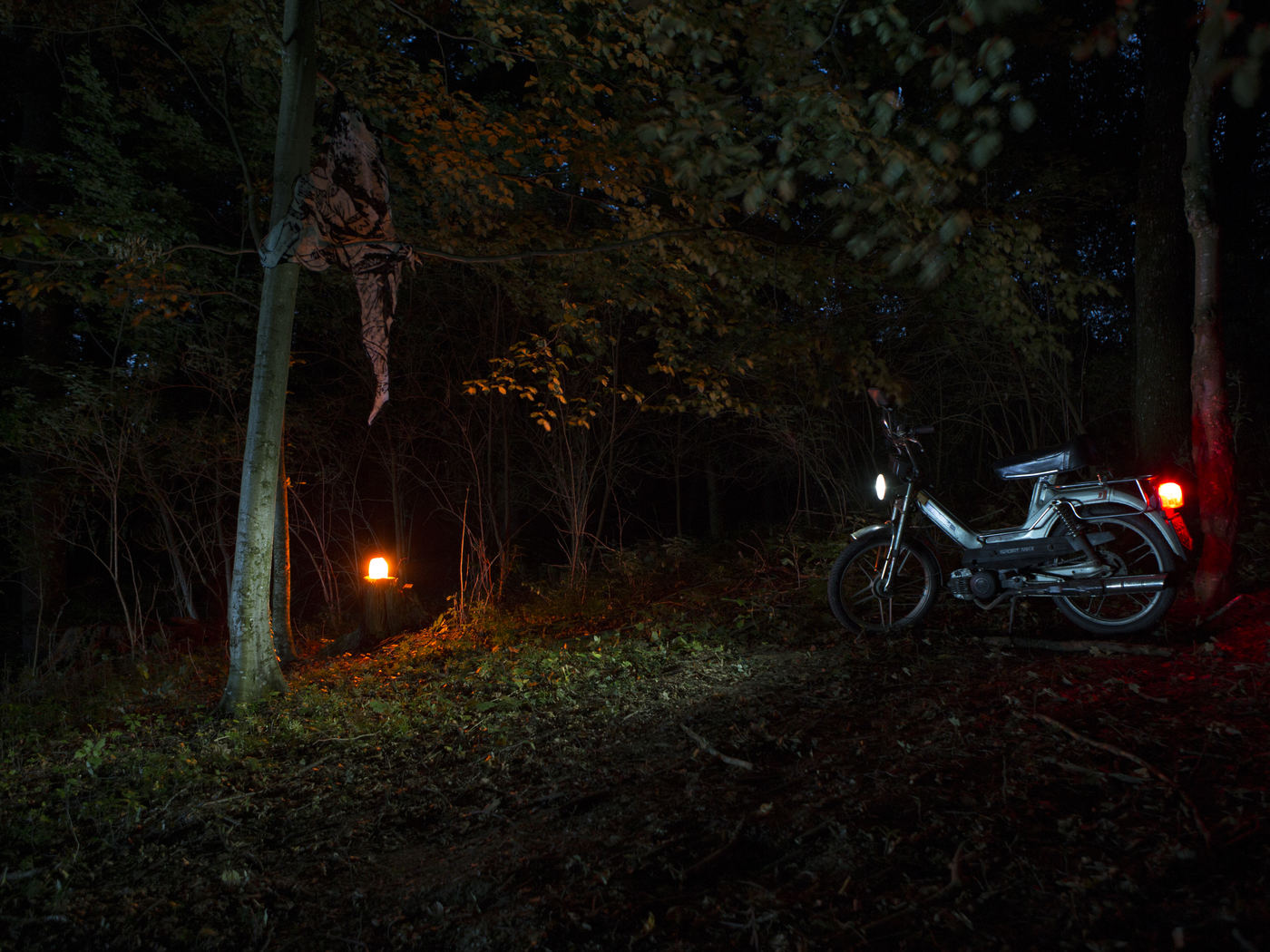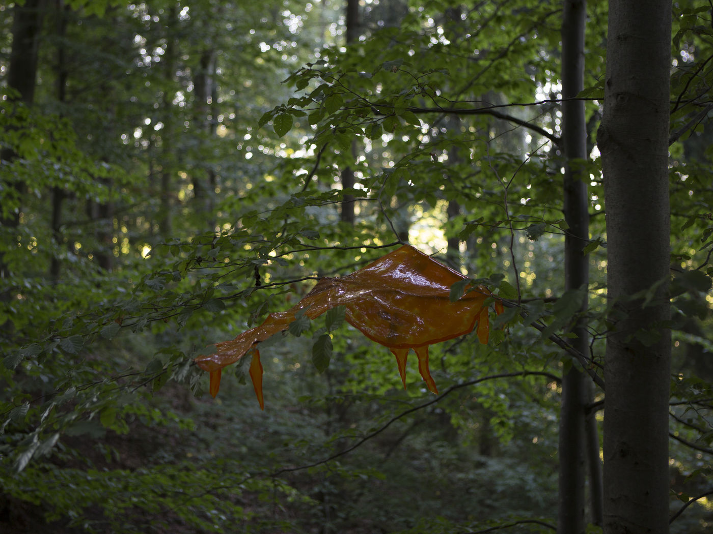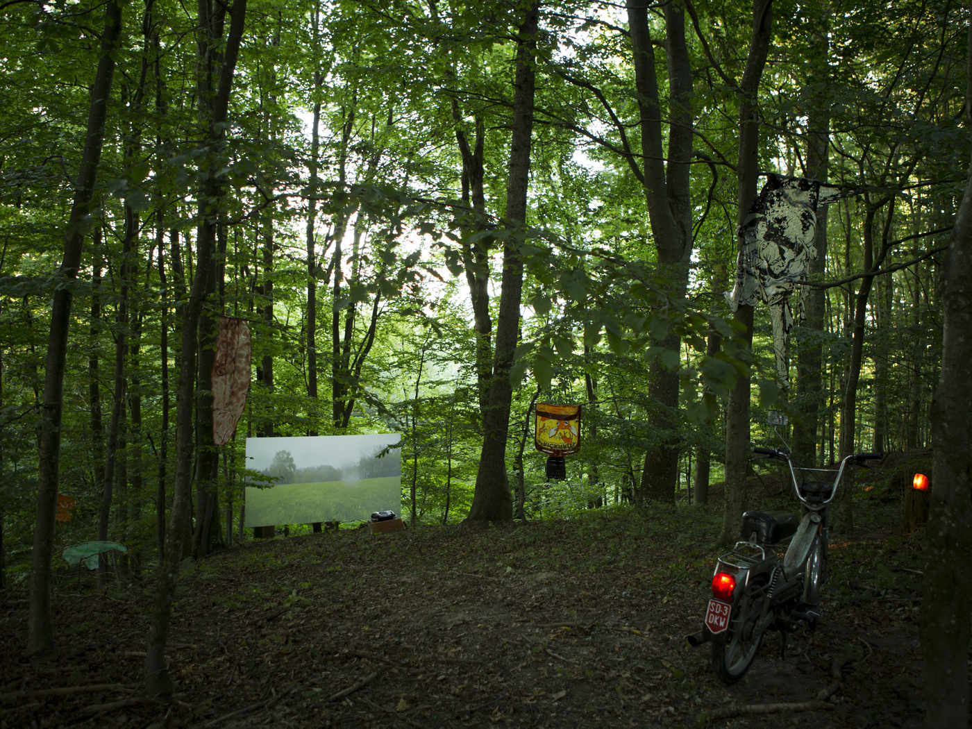 Digital games and video clips are the basis for reconfiguring the protagonist’s constitution. With a camera mounted on her forehead she skips through nature settings and renderings. The scenery is a deciduous forest embedding the gateway video projection and paleolithic cave paintings. Deer as audience is synthetic and naturally attracted.